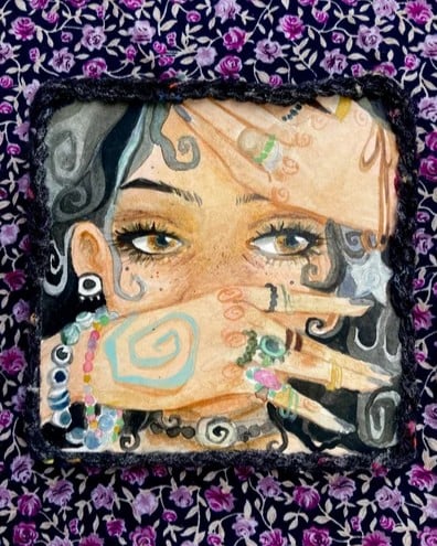♥ Original watercolor, color pencil, and fiber artwork mounted on wood panel.